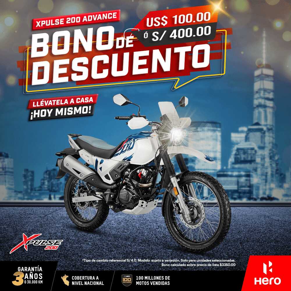 | Xpulse 200 | ![]() | PRECIO 2023: USD$ 3.350* – S/ 13.400 | $100 o S/ 400 |